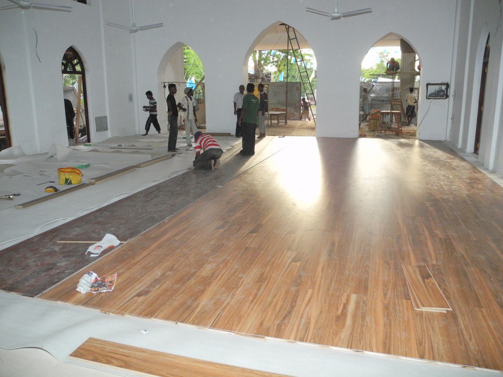 Installing floor tiles of the church, painting outer church final coat